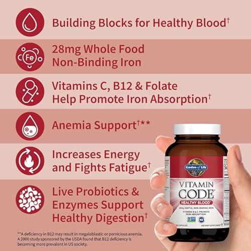 Garden of Life Vitamin Code Healthy Blood – Iron Supplement for Women, 60 Vegan Capsules, with Vitamins B, C, Trace Minerals, Fruit Veggies, Probiotics – for Energy and Anemia Support